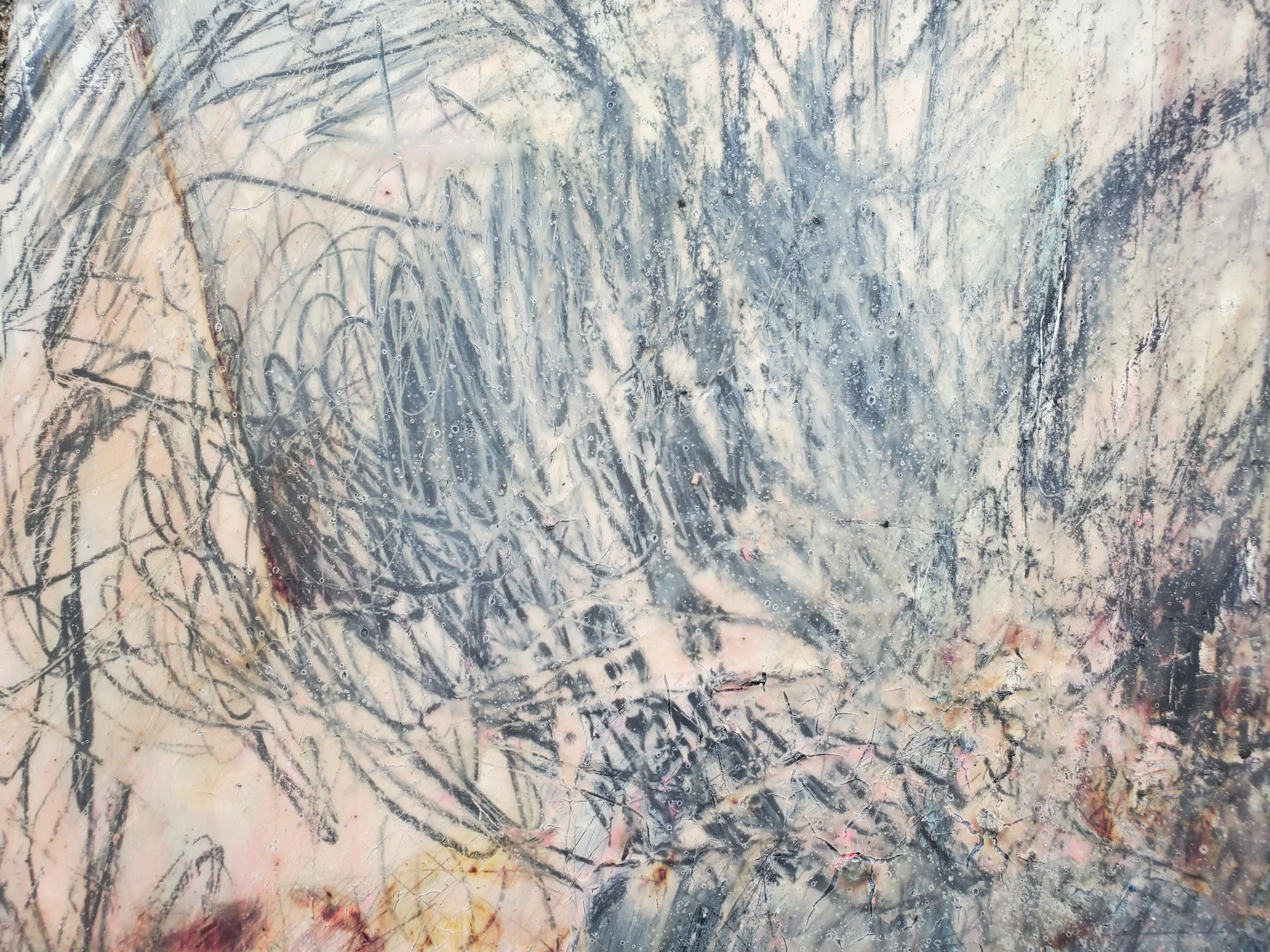 Oil, wallpaper paste, graphite, lithography ink, charcoal, baby oil and acrylic medium on MDF